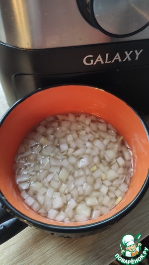Вторую головку репчатого лука мелко порезать и замариновать. Маринад из уксуса, холодной воды, сахара и соли, оставить минут на 30.