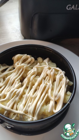 Следующий слой картофель, промазать майонезом.