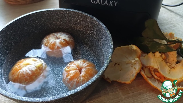 Три мандарина, очистить от шкурки, залить водой, и поставить вариться. Вес очищенных мандаринов, должен быть примерно 200 гр.