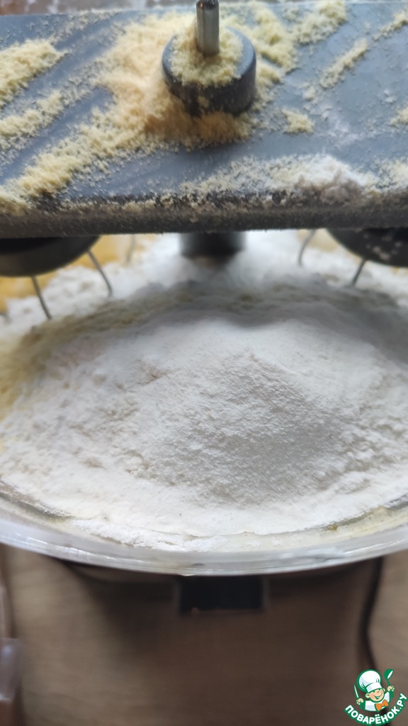 Добавить два вида муки, растопленное сливочное масло и разрыхлитель.