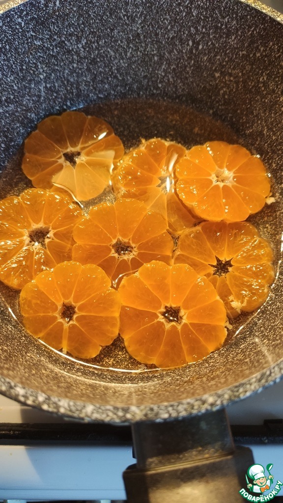 Сварить сироп из воды и сахара, выложить кружочки очищенных мандарин, проварить минуты 2, оставить остывать в сиропе.
