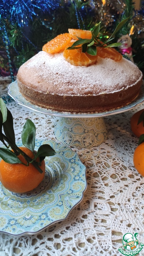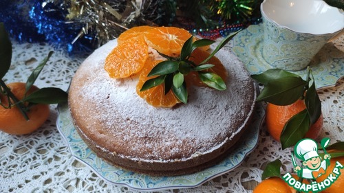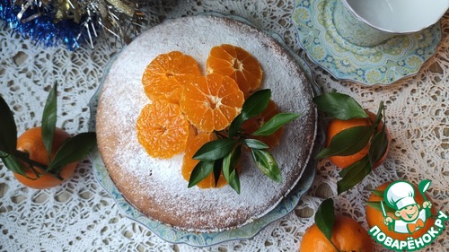 Готовый кекс украсить мандаринами и сахарной пудрой.