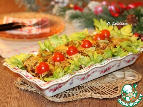 • 10. Сверху равномерно раскладываем соте из баклажанов. Обратной стороной большой ложки проводим глубокие 3 полоски. Овощной сок от соте, проникнет внутрь мясного пудинга и пропитает его. Посыпаем сверху панировочными сухарями (1-2 ст. л.).