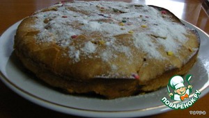 Готовый пирог можно смазать сметаной,будет очень нежным.Я посыпала сахаром + немножко сахарных украшений.