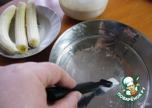 Порезать бананы на искосок толщиной 5-6 мм и выложить ими всю поверхность теста.