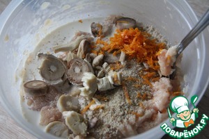 В фарш добавить грибы, цедру апельсина, перец, соль. Грибы лучше брать маленькие и класть целиком. Я выбрала вариант с крупными грибами, чтобы часть из них порезать в фарш, а часть (шляпки) использовать целиком.