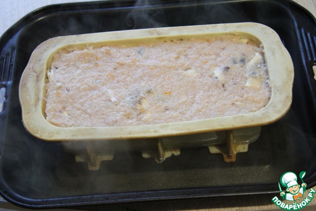 Заполнить шляпки и форму фаршем. Поставить форму в бОльшую емкость, заполненную горячей водой до уровня, выше середины высоты формы с фаршем.