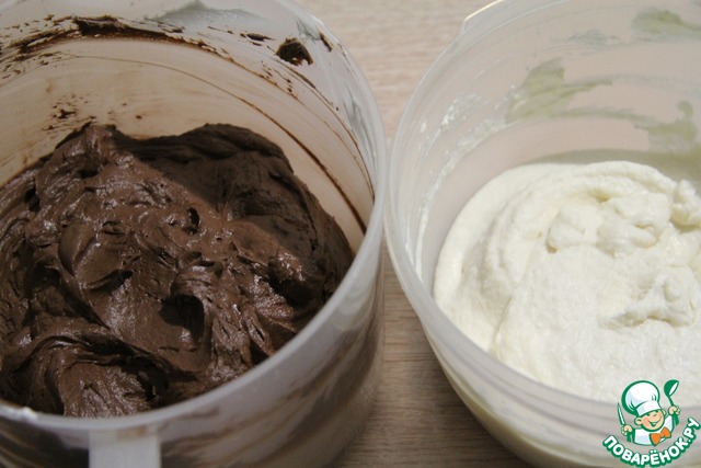 Весь объем сливочной массы разделить на две неравные части: 1/3 и 2/3. В бОльшую ввести темный растопленный шоколад, в меньшую - белый. Все хорошо перемешать.