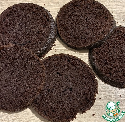 Разлить в три формы (18 см), застеленные пекарской бумагой. Выпекать при 180 градусах около 30 - 40 минут (проверяйте зубочисткой). Полностью остудить. Завернуть в пищевую пленку и оставить часов на 6 или всю ночь.