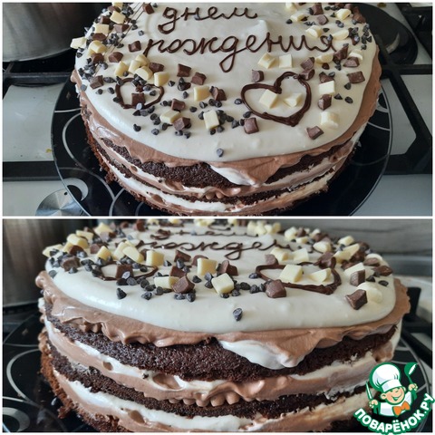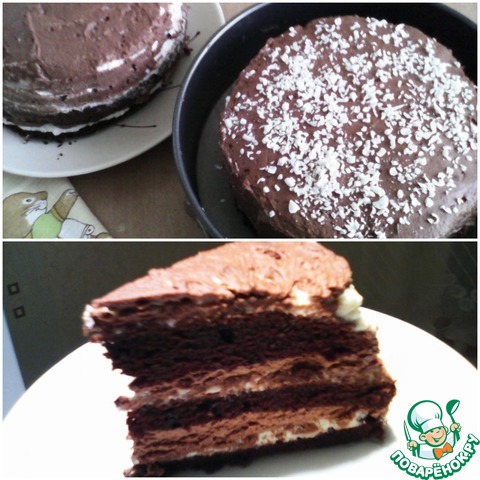 Собрать торт, промазывая каждый корж сначала белым кремом (он тонкий получится), затем -темным. Можно сделать один торт, но он получается очень высокий, как сейчас модно, а так - два отличных торта выйдет. Я готовила оба варианта. Решать вам.