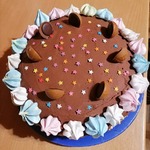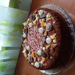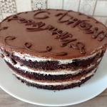 [+5]О приготовлении. У меня половина нормы, выпекался бисквит за один раз в форме 18 см, разрезала на три коржа без проблем. Но сверху шапку порвало с одной стороны, а так пористый, сахара убавила. Оба крема замечательные, стабильные, сах. пудры взяла чуть меньше. На белый крем шоколадный выложить было сложновато, но можно. На срезе мои слои смазались, а при дегустации хорошо видны. Украсила как смогла.