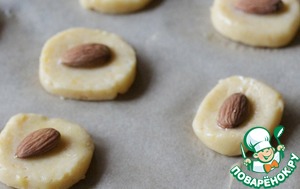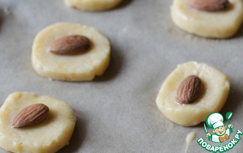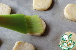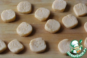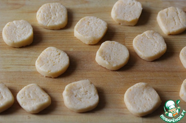 Достать тесто из холодильника и нарезать его на кружки толщиной 0,5 см. Разложить их на противне. -