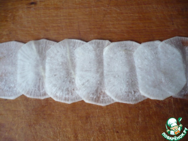 Для украшения салата я взяла дайкон. Нарезать его тонкими кружками. Налить в миску холодной воды добавить 1 ч. л. соли и положить нарезанный дайкон минут на 10-15 (полежав в воде дайкон станет мягким). Выложить его на бумажное полотенце, просушить, а затем выложить кружочки из дайкона внахлёст.