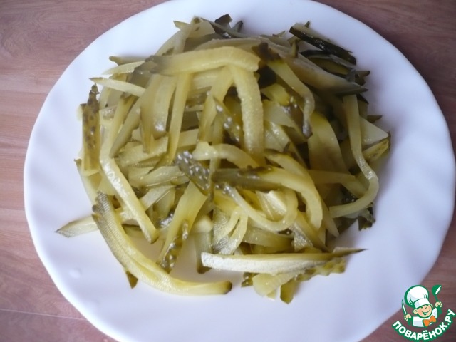 Для салата берем маринованные огурчики и также нарезаем их соломкой.