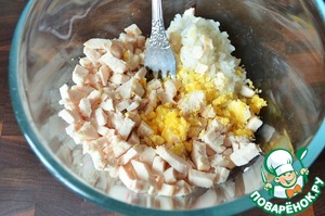 Остатки сыра, белки, молотый белый перец добавить в салатник. -