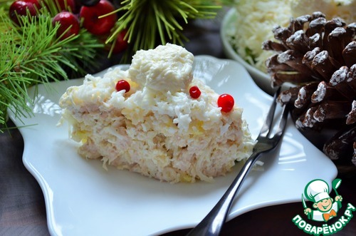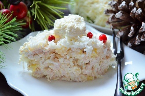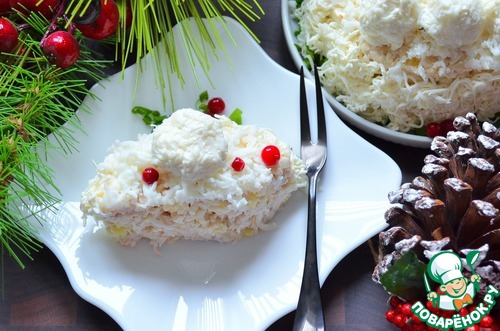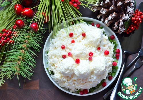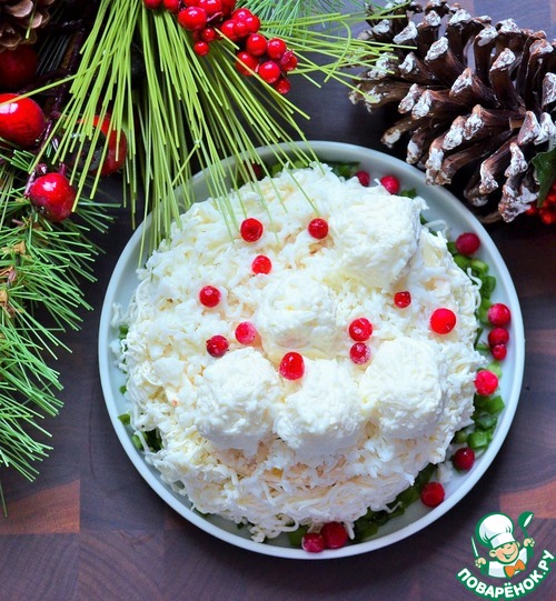 Зима, Новый год, снег... Со снегом в этом году пока сложновато, его очень мало или нет совсем. А почему бы не порадовать гостей, не угостить их красивым, вкусным салатом. Заодно и снег увидим... С Наступающим!
