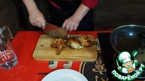 Режем ещё горячего цыплёнка на небольшие кусочки, укладываем на тарелку... -