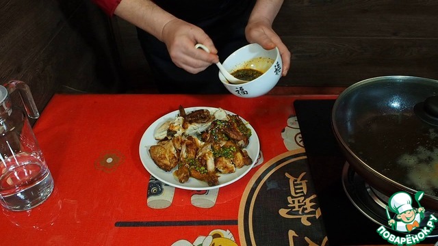 Добавляем сахар, вино, соевый соус, чили масло и кунжутное масло, бульон и молотый сычуаньский перец. и тщательно перемешиваем. -