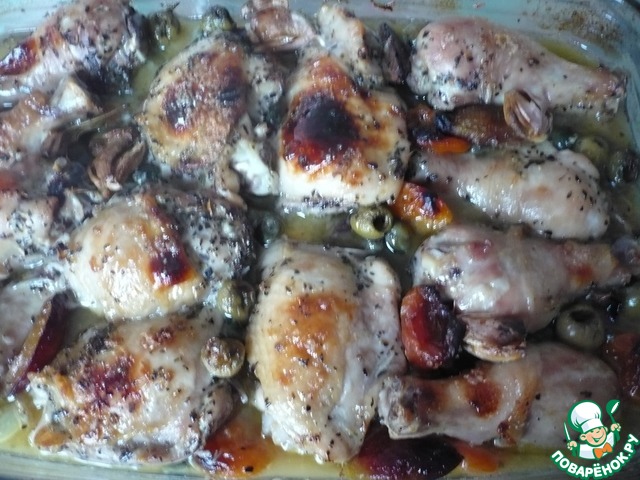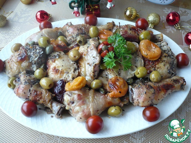 Курица с сочными сливами, курагой, с зелеными оливками, каперсами, белым сухим вином и орегано - блюдо праздничное, с потрясающим ароматом. Просто смешайте все ингредиенты в форме для запекания, замаринуйте и поставьте в духовку и ваш дом наполнится летними ароматами.