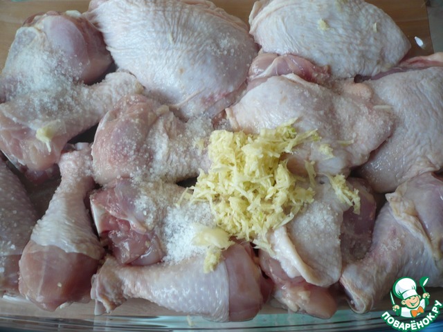 Посолите куриные бедра и голени. Затем измельчите 5 зубков чеснока на мелкой терке и руками натрите все кусочки курицы.