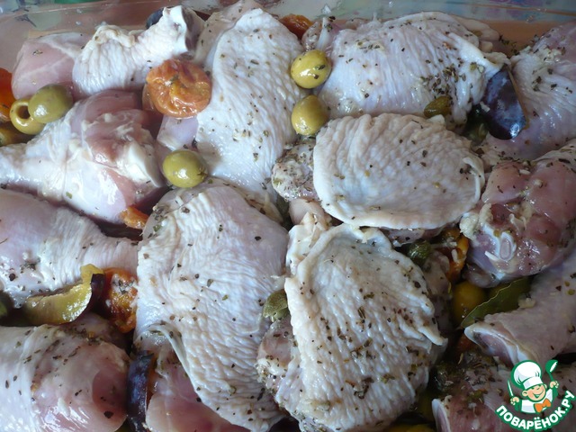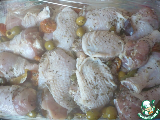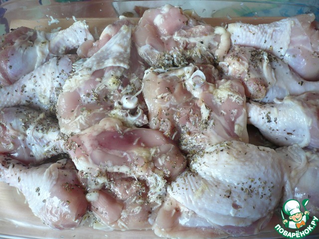 Приготовленные куски курицы выложить в форму для запекания на маринад. Все хорошо перемешать.