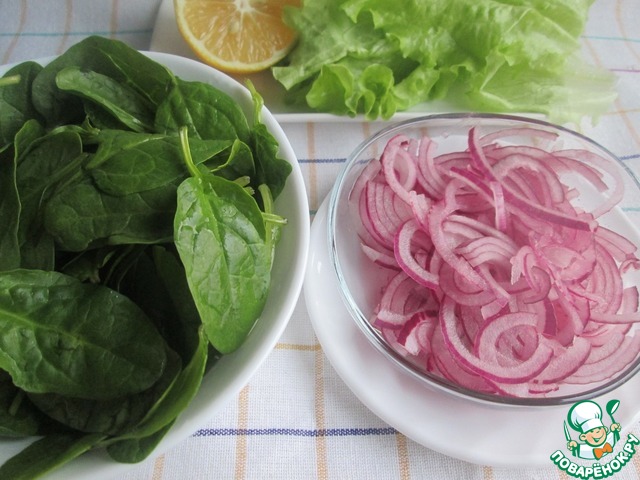 Смешать шпинат, листья салата (порвать руками) и маринованный красный лук.