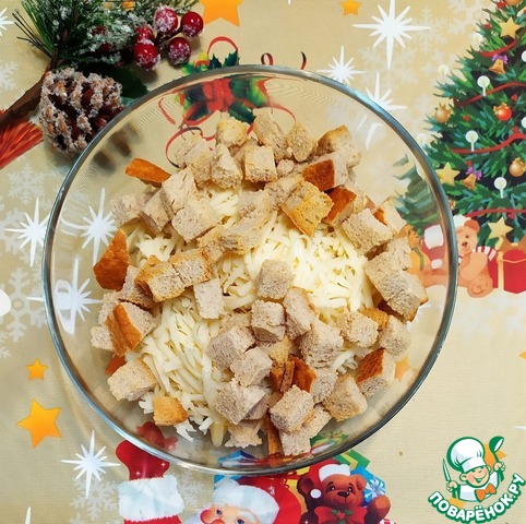 Приготовить все необходимые продукты для салата. Приступим. Батон нарезать на кубики и поставить в разогретую до 180 градусов духовку на 15 минут.