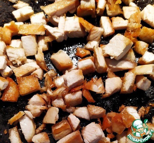 Заранее промыть филе индейки. Отварить до готовности, затем остудить. Порезать кубиками, слегка обжарить на сковороде. Выложить в большую чашу для удобства.