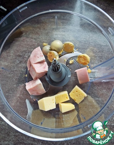 • В чашу комбайна поместить желтки, сыр и ветчину.