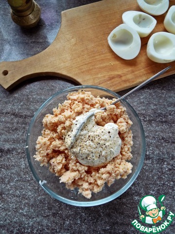 • Очищенные яйца разделить пополам, извлечь желток.