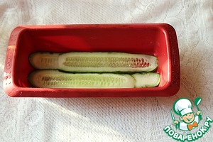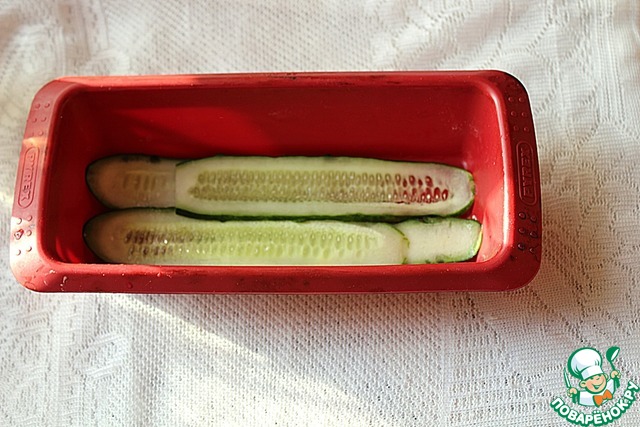 В силиконовую форму размером 10 х 24 см и высотой 6 см положить тонкие полоски огурца так, чтобы они перекрывали друг друга. Если форма не силиконовая, её нужно застелить пленкой.