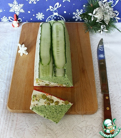 Предлагаю приготовить нежный сырно-творожный мусс. В одну часть добавим шпинат, в другую - горошек с кабачком, и покроем всё это желе из печеного перца. Такая закуска будет хорошо смотреться на праздничном столе.