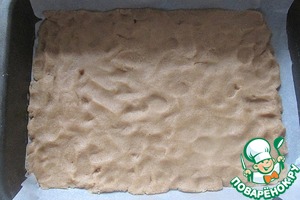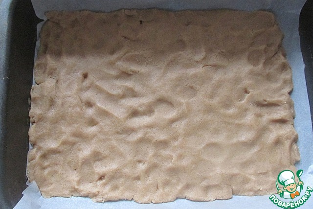 Форму (25х18 см) застилаем пергаментом и руками распределяем тесто, желательно равномерно.