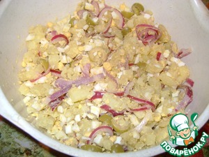 Остывший лук отжать и вместе с оливками добавить к остальным ингредиентам.