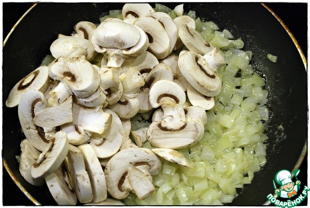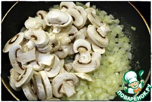 Приступаем к соусу. Растапливаем сливочное масло, добавляем мелко нарезанный лук и пассеруем около двух минут. Добавляем грибы, солим-перчим, перемешиваем, тушим пять минут.