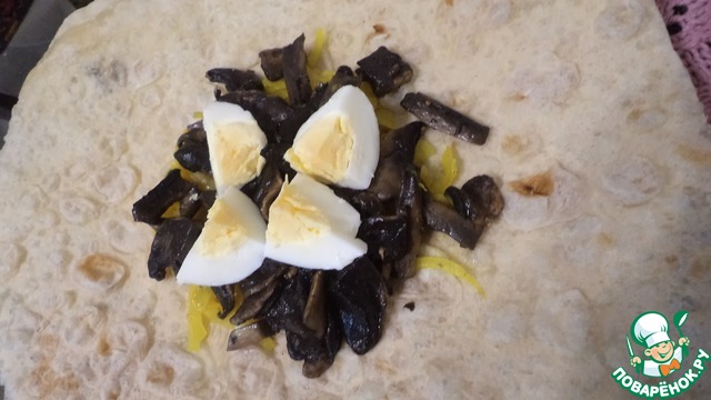 Нарезать шампиньоны и обжарить их до испарения влаги на сливочном масле. Обжарить лук на сливочном масле с добавлением соли, перца и куркумы. Остудить. Большой лаваш разрезать на 2 части и срезать неровные кромки. Из кромок сделать полоски для обмотки мешочков! На середину каждой части лаваша положить пластинки сыра, на сыр выложить обжаренный лук.