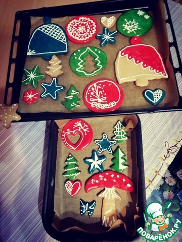 С помощью широкой мягкой кисточки пряники покрываем специальным пряничным лаком, а затем украшаем узором из айсинга. Как это сделать, как приготовить лак и айсинг можно прочитать в моем рецепте "Пряничный лак и айсинг" https://www.povareno k.ru/recipes/show/16 1855/ -