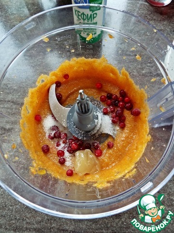 • Добавить клюкву, мед и сахар. Быстро пробить до однородности.