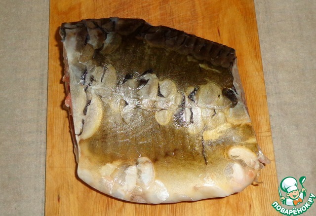 Карпа выпотрошить и очистить, отрезать голову и хвост. Именно эту часть удобно запекать и кушать, так как присутствуют в основном крупные косточки.