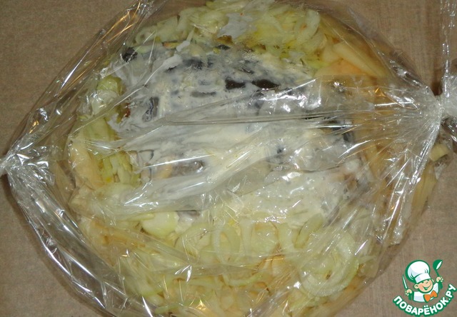 Завязать рукав, отправить в духовку на 1,5 часа, готовить до румяности при температуре 170-180 градусов.