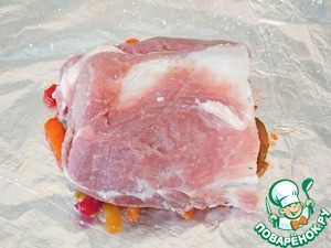 Разложить оставшиеся овощи по всей поверхности свинины.
