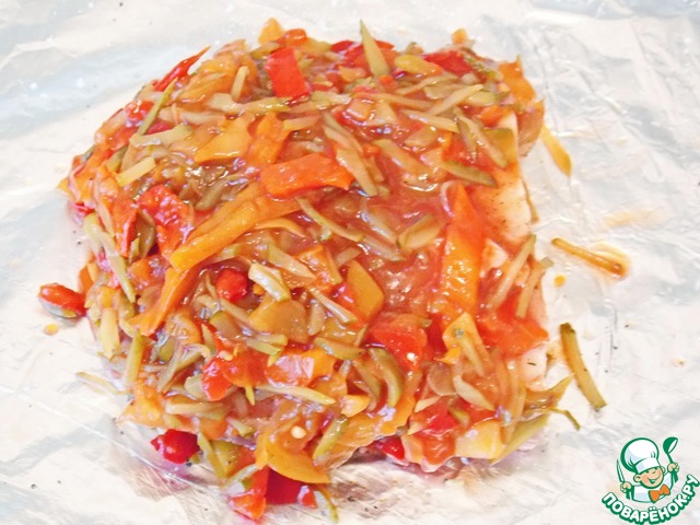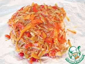 Берем большой кусок фольги и смазываем его маслом. Кладем слой подготовленных овощей и кладем сверху мясо, солим и перчим.