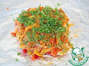 Порежем укроп и посыпаем по верх овощей.