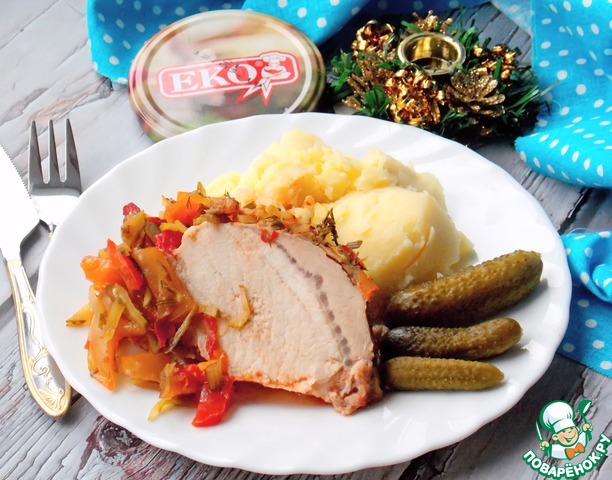 Вкусная и сочная свинина, запеченная в фольге с добавлением огурчиков и лечо от ТМ « ЭКО». Делается быстро, просто и прекрасно подойдет к праздничному столу