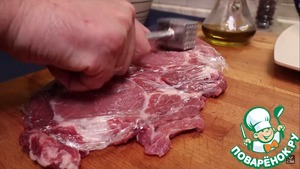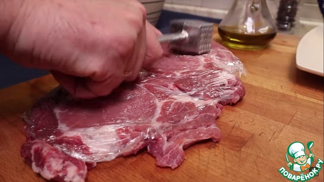 1. Первым делом приступим к мясу. Завернем его в пищевую пленку и отобьем.
