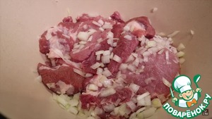 2. Порежем лук на мелкие кусочки, помнем его в руках, чтобы он выделил сок и добавим в мясо. Оставим мариноваться 15- 20 мин.