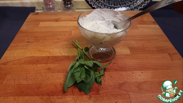 3. Пока маринуется мясо и разогревается духовка до 180 С, приготовим соус. Добавим в греческий йогурт ложку хрена, горчицы, мело нарезанный базилик и чеснок. Все перемешиваем.