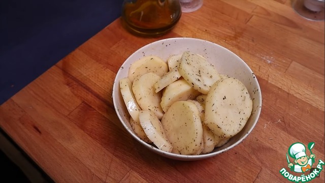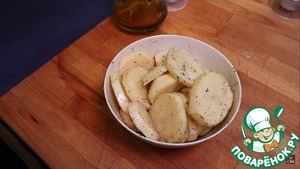 4. Режем картофель на ломтики. Добавляем соль, перец, 1 ст. л оливкового масла и прованские травы. Перемешиваем.