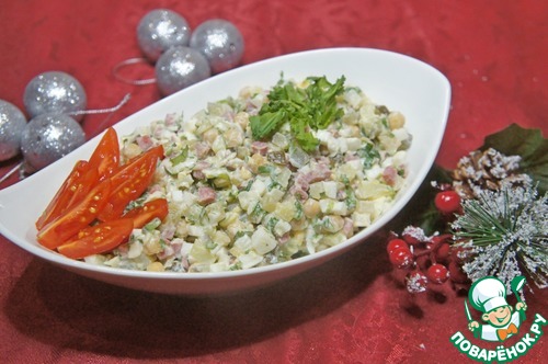 Муж попросил сделать мясной салат, но не Оливье, а что-нибудь новенькое. Говорит, что поднадоели салаты из свежих овощей за лето и осень. Вот я и сделала. Муж был в восторге и попросил повторить салатик на новогодний стол. На самом деле я собрала остатки. От гостей осталась полукопченая колбаска, а от супа фанеска половина банки консервированного нута. И получился у меня такой салатик.