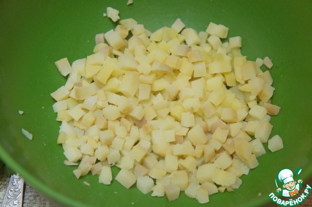 • Картофель нарезать маленькими кубиками и поместить в глубокую миску.